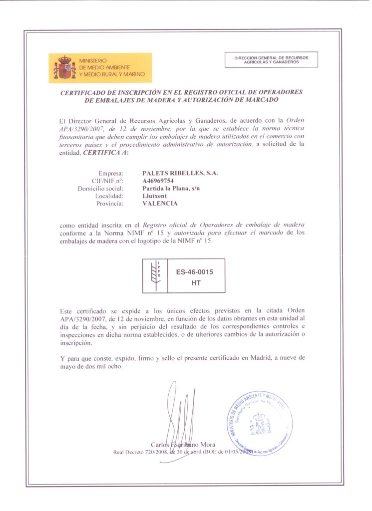 Palets Ribelles cumple la normativa fitosanitaria NIMF15, que regula la aplicación de calor y el control de la humedad sobre el palet, siendo apto el producto para la exportación a cualquier país del mundo.