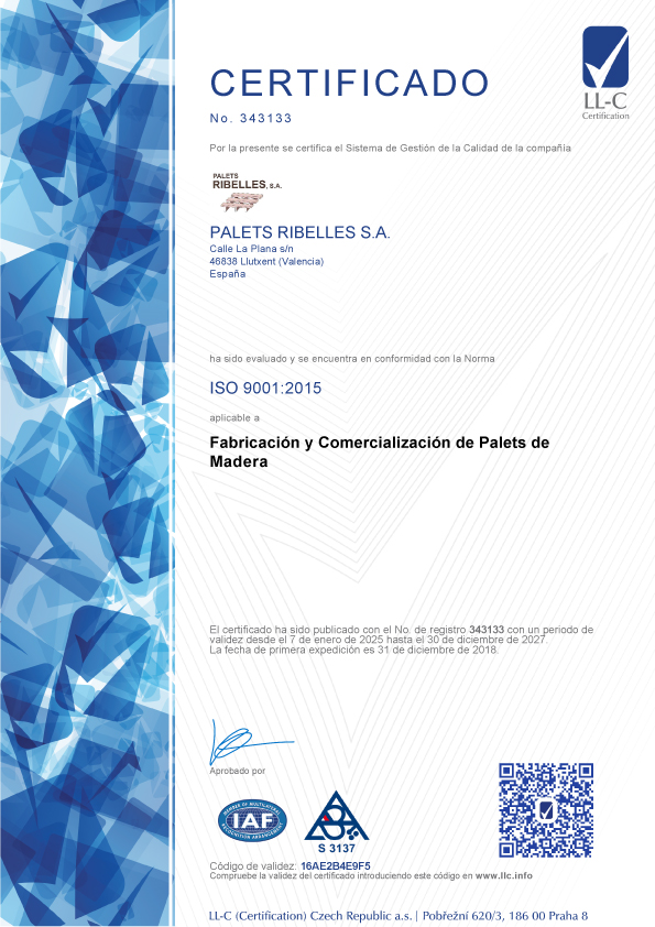 Palets Ribelles cumple la norma ISO 9001:2015, que regula la fabricación y comercialización de envases y embalajes de madera.